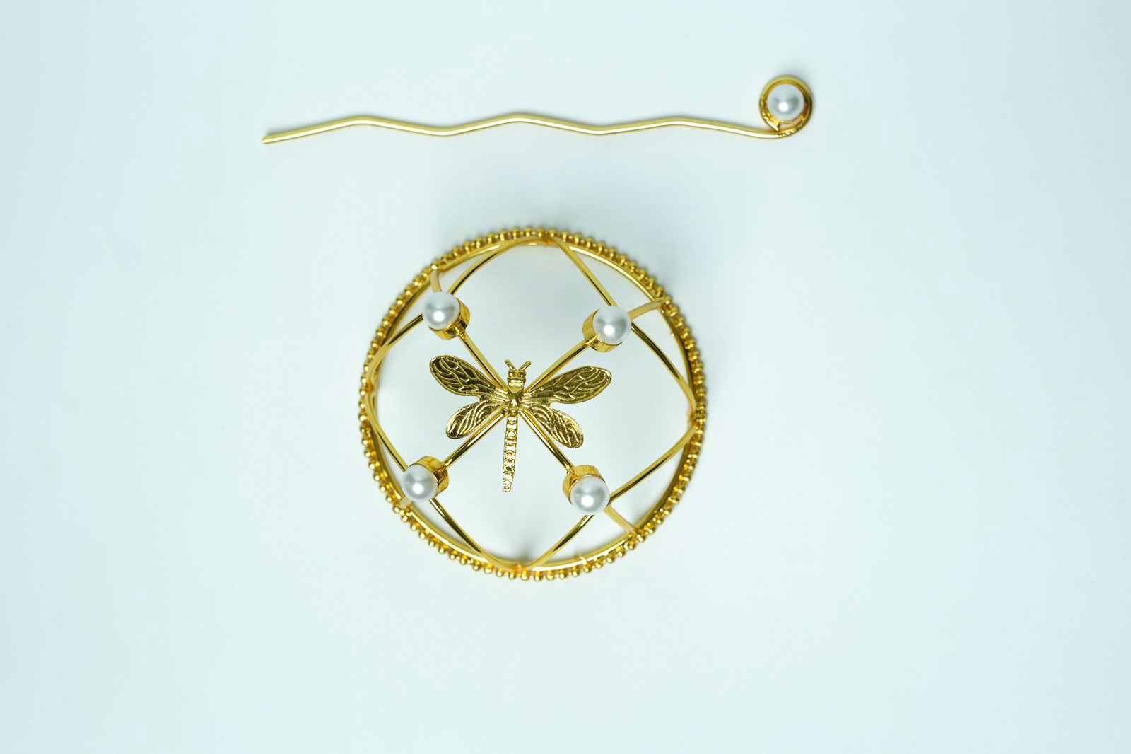 A mesmerizing gold-toned hair accessory featuring a detailed dragonfly centerpiece surrounded by lustrous pearls on a beaded circular frame. Symbolizing elegance and renewal, it adds a graceful, nature-inspired charm to festive and bridal hairstyles.