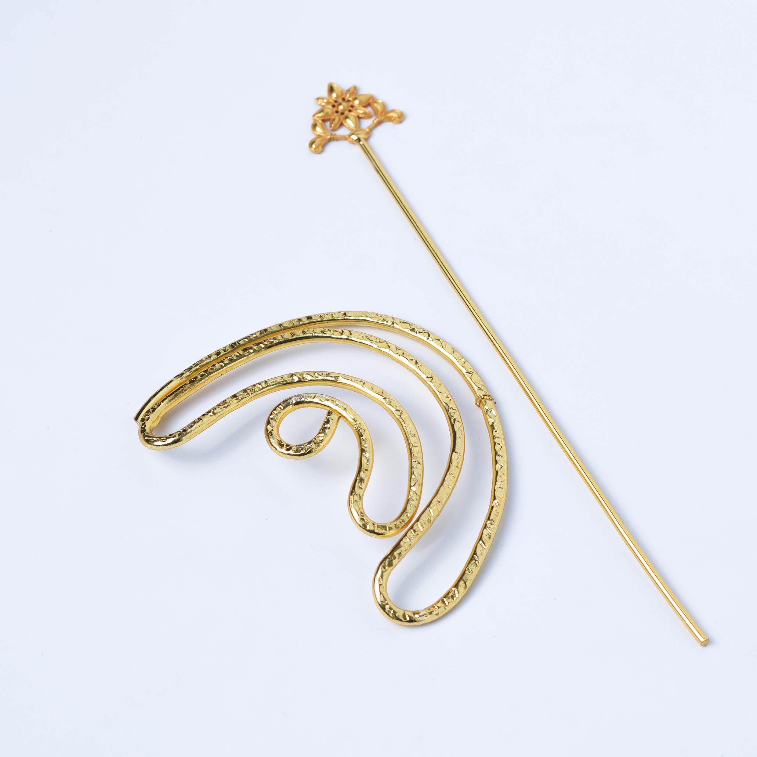 Add flow and finesse to your hairstyle with the Golden Cascade. This gold hair accessory features hammered spiral curves and a floral stick, perfect for casual glam, ethnic events, and artistic styling.