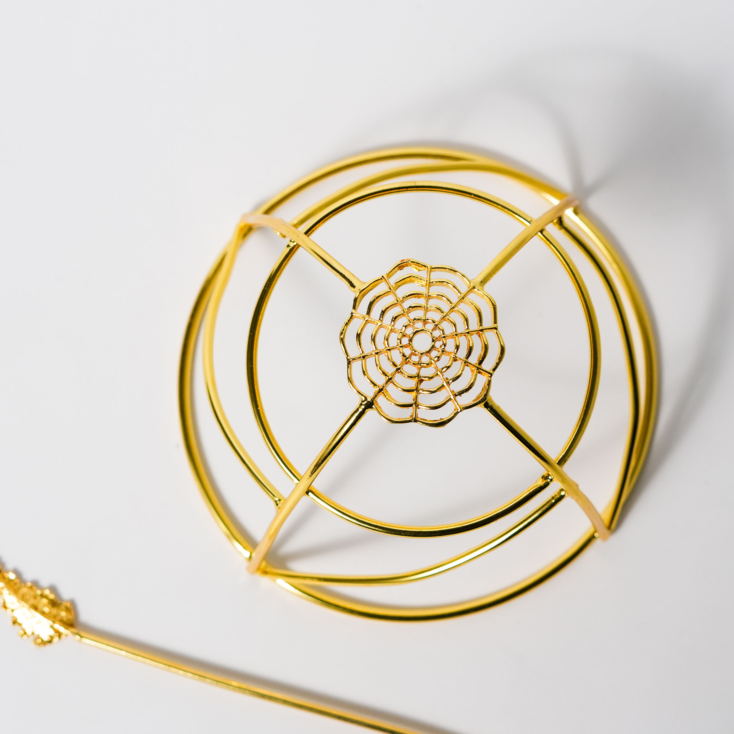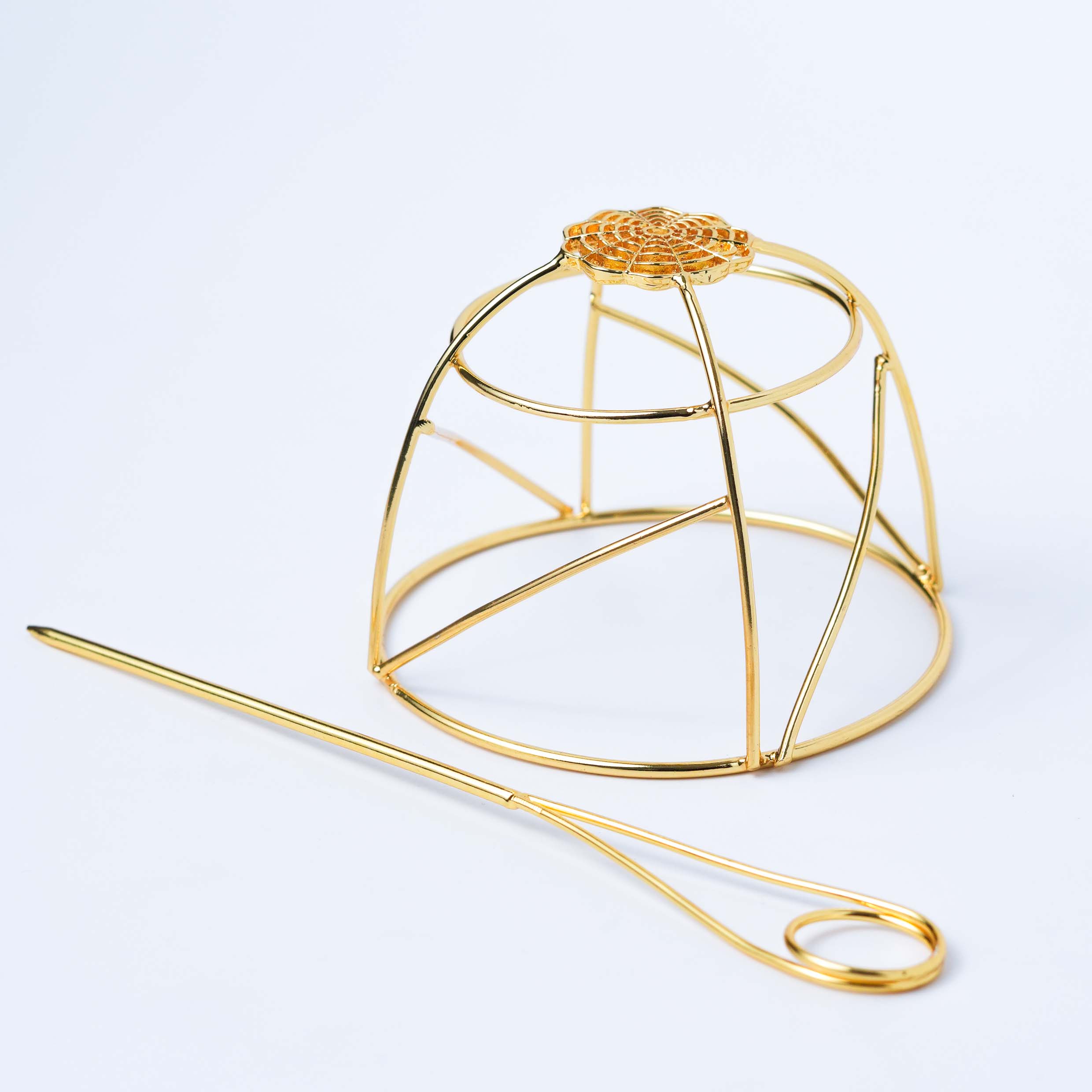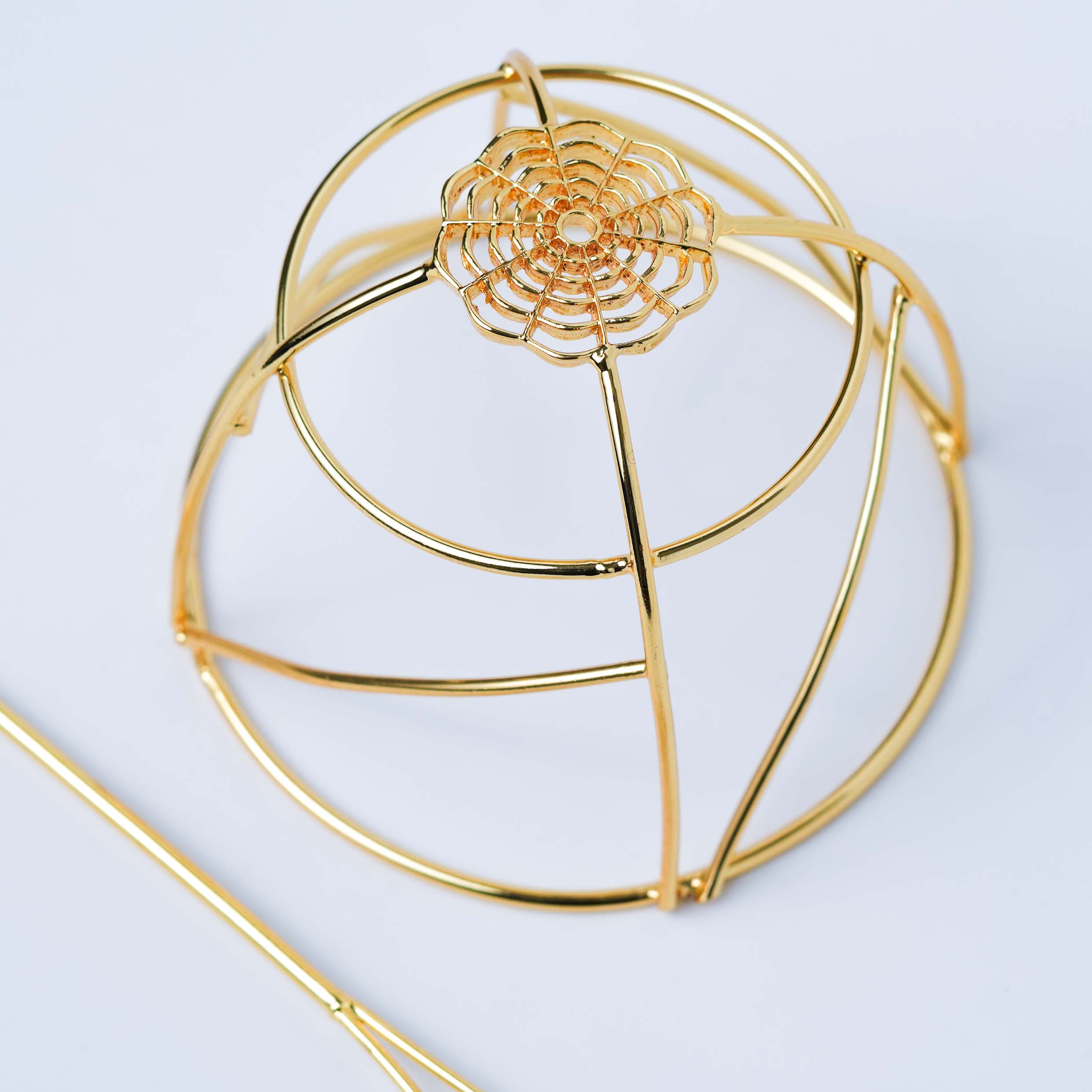 The Petal Prism combines floral beauty and geometric strength. With a bold gold flower crowning a modern cage design and a loop-end stick, it’s a standout piece for weddings, haldi ceremonies, or photoshoots.