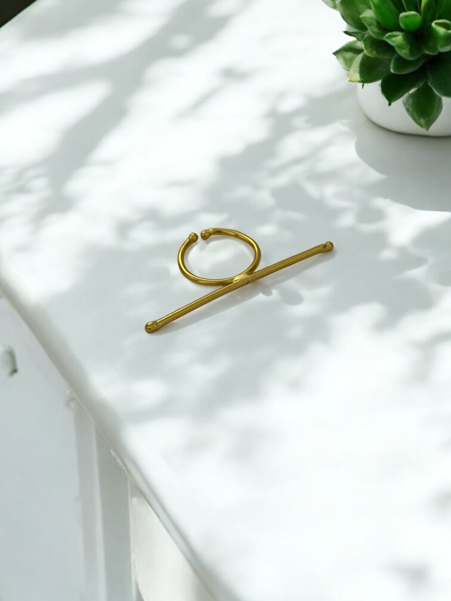 Minimal yet impactful, the Solbar Ring features a sleek open band paired with a horizontal golden bar, creating a bold architectural silhouette. Perfect for modern styling, this statement finger ring is adjustable and effortlessly chic — ideal for stacking or standing out solo.