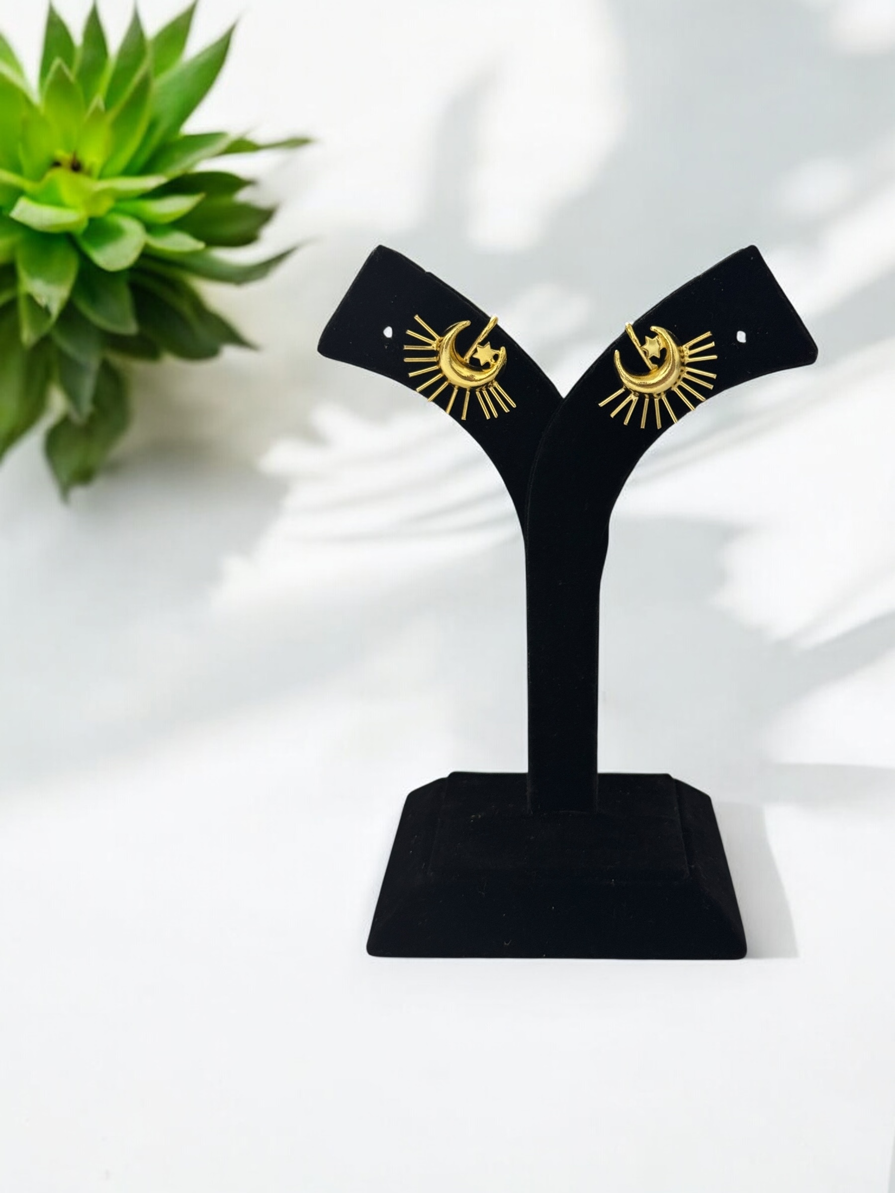 Channel cosmic energy with Soluna Studs, a stunning blend of sunray spikes and crescent moon motifs in radiant gold. These bold yet lightweight earrings add a touch of celestial magic to any outfit—perfect for starry nights or sunlit soirees. Ideal for modern mystics and cosmic dreamers alike.