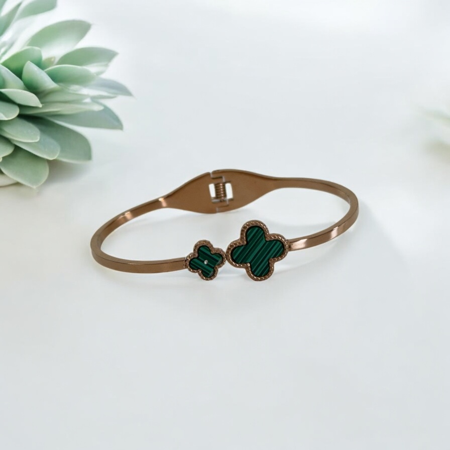 A sleek gold bangle adorned with two green clover-shaped inlays of differing sizes, symbolizing harmony and balance with a touch of natural elegance.